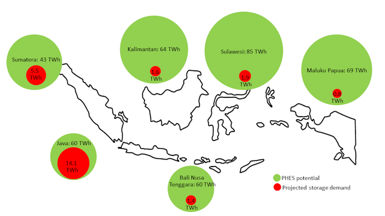 Potensi PHES di luar wilayah sungai di Indonesia. Lingkaran hijau dan merah masing-masing menunjukkan kapasitas PHES dan penyimpanan yang diperlukan.