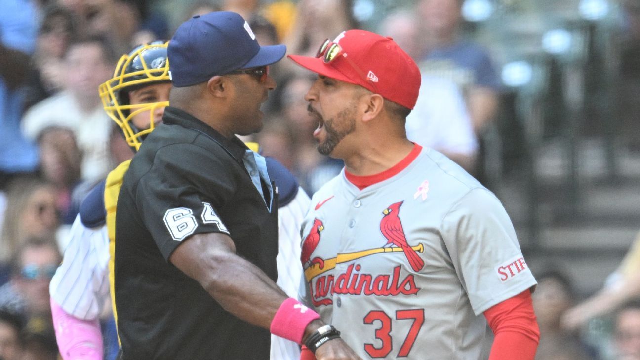 MILWAUKEE — Manajer St. Louis Oliver Marmol dan pelatih bangku cadangan Daniel Descalso dikeluarkan dari pertandingan hari Minggu dengan Milwaukee Brewers setelah Cardinals berhasil menantang dua panggilan terpisah di base pertama.